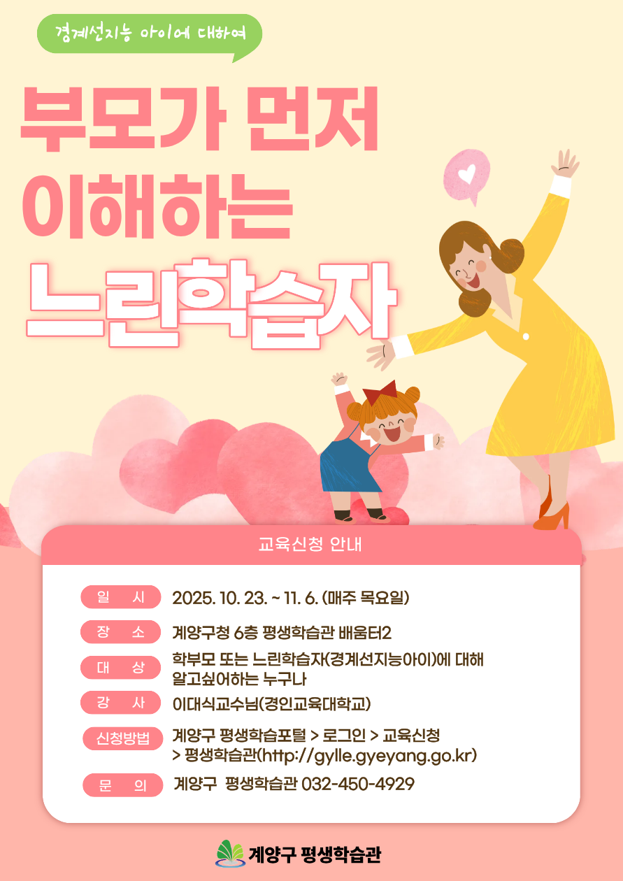 ▶ 수강신청 바로가기 링크 : 평생학습관-[평생학습관]부모가 먼저 이해하는 느린학습자(경계선지능아이) 내용 | 계양구 평생학습포털>교육신청