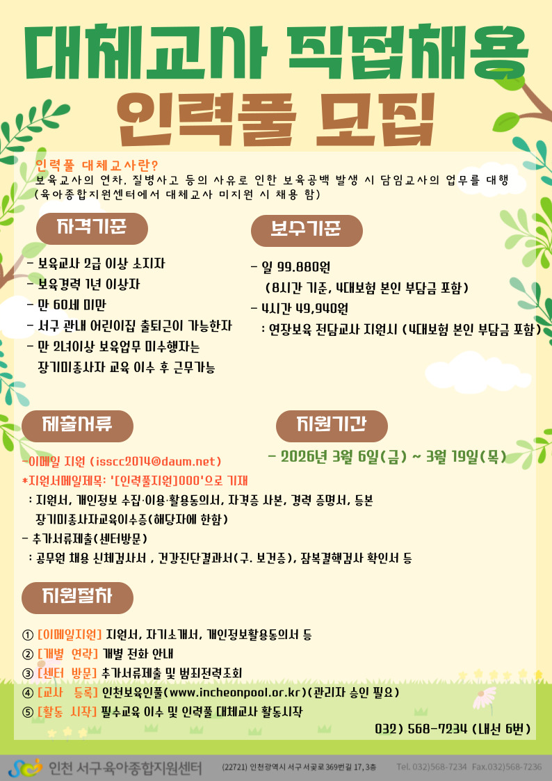 [인천서구육아종합지원센터] 「2026년 대체교자직접채용 인력풀 모집」 공고
