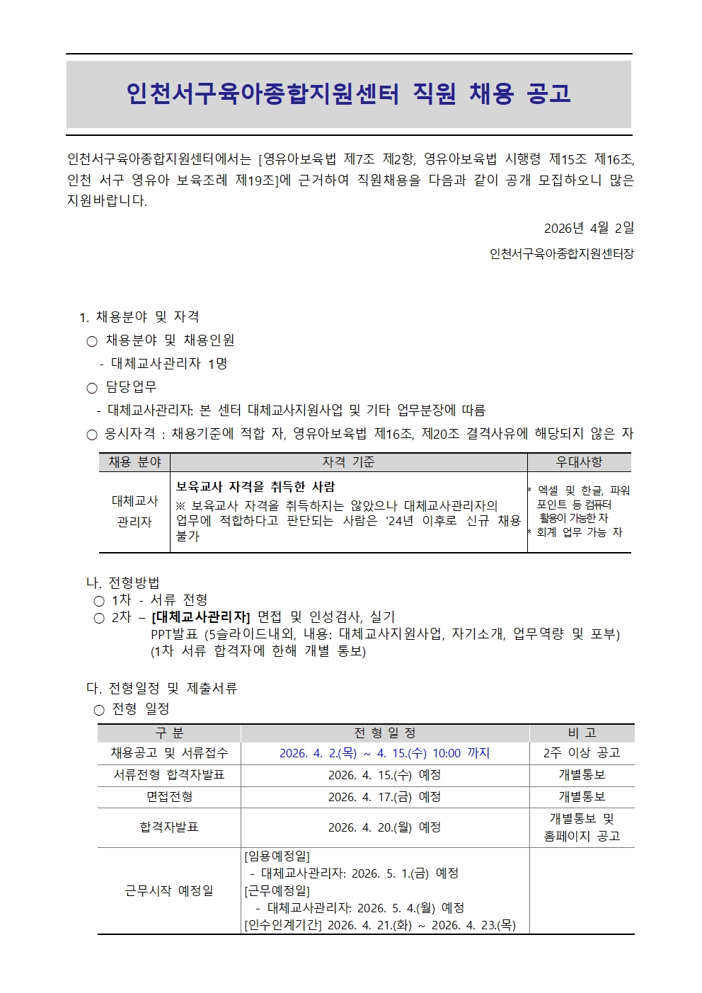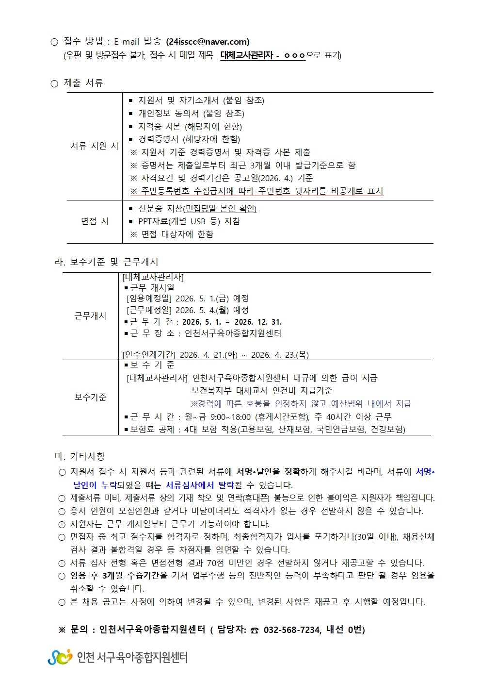 [인천서구육아종합지원센터] 직원(대체교사관리자) 채용 공고 홈페이지 게시