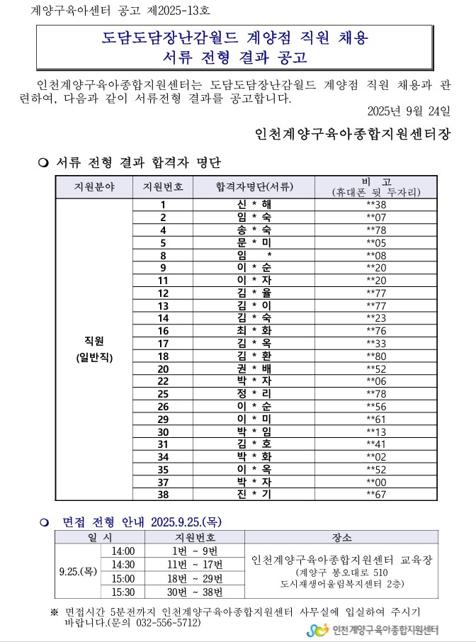 도담도담장난감월드 계양점 직원 채용 서류전형 결과 공고