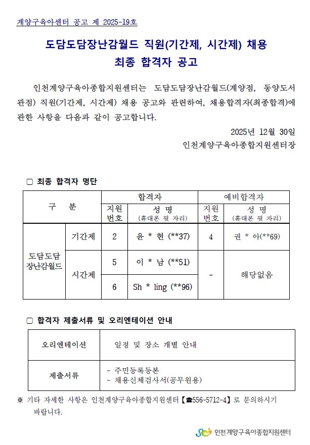 도담도담장난감월드(계양점, 동양도서관점) 직원(기간제, 시간제) 채용 최종합격자 공고