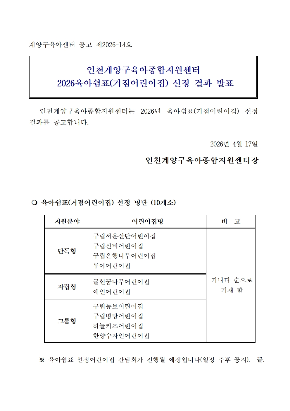 2026년 육아쉼표(거점어린이집) 선정 결과 발표
