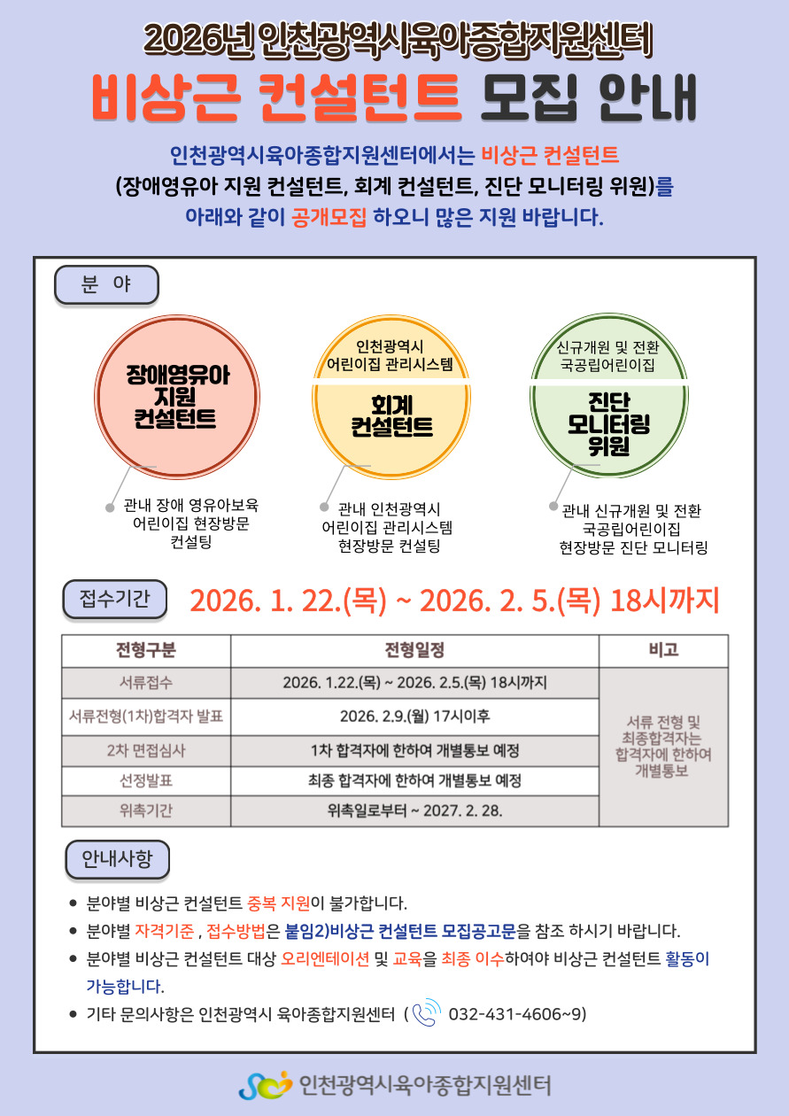[인천광역시육아종합지원센터] 2026년 인천광역시육아종합지원센터 비상근 컨설턴트 모집