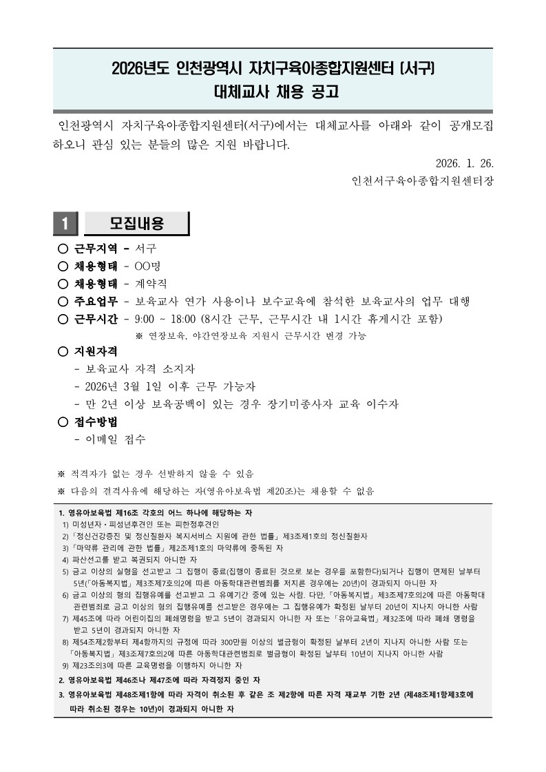[인천서구육아종합지원센터] 2026년 4차 대체교사 채용 공고