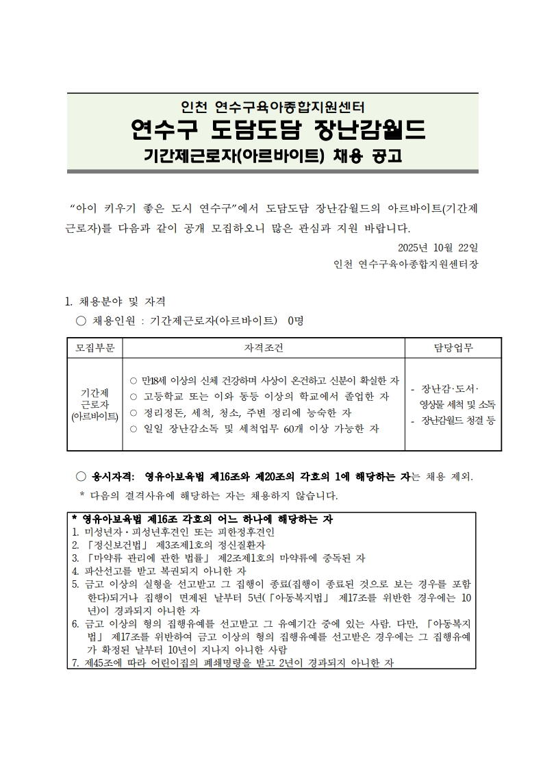 [연수구 도담도담 장난감월드] 기간제(아르바이트) 근로자 채용공고
