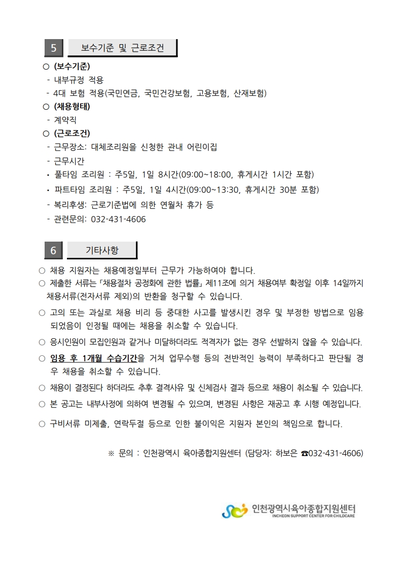 [인천광역시육아종합지원센터] 대체조리원지원사업 대체조리원 인력 채용 공고