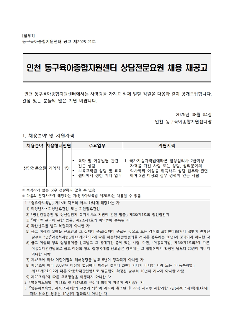 [인천 동구육아종합지원센터] 상담전문요원 직원 채용