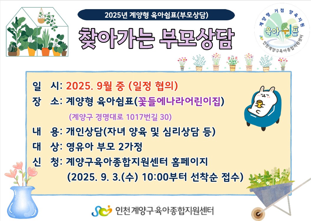 | 유의사항 | 계양형 육아쉼표 교육으로 지역의 거점어린이집에서 진행됩니다. 교육 장소는 꽃들에나라어린이집 입니다. (계양구 경명대로 1017번길 30) |