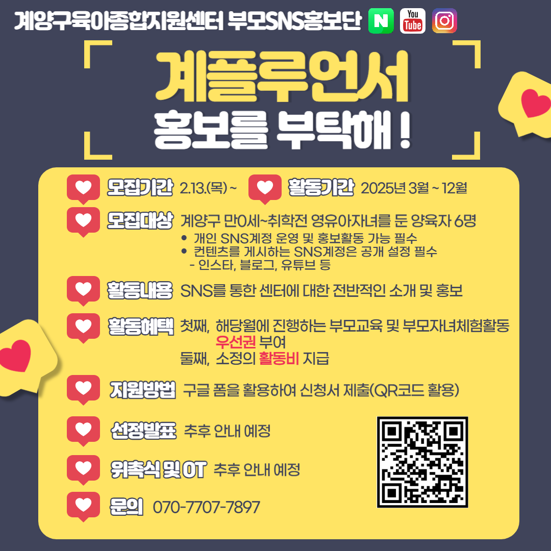 | 기타사항 | 인스타그램, 블로그 등 SNS를 운영하는 계양구 영유아 부모님들의 많은 관심과 참여 바랍니다~ 하단의 링크로 신청해주세요 https://form.naver.com/response/Umj4NSzrMLcD8TxYcY5f6g |