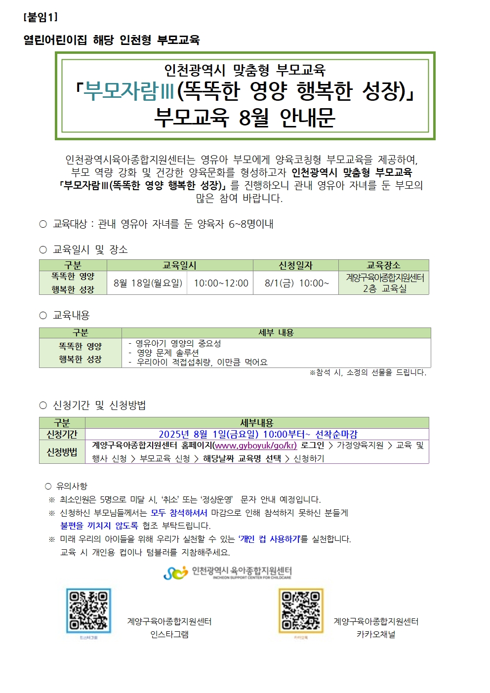 | 기타사항 | **참여 안내 및 유의사항** ※5명 미만 신청 시 교육이 취소될 수 있습니다. (취소 시 전화 혹은 문자로 안내드리겠습니다.) ※신청하신 부모님들께서는 모두 참석해 주시기 바랍니다. 3회이상 미참여시 다음 체험 및 교육신청에 제한됩니다. ※취소 시, 반드시 전화로 연락해 주세요 (032-556-5714). |