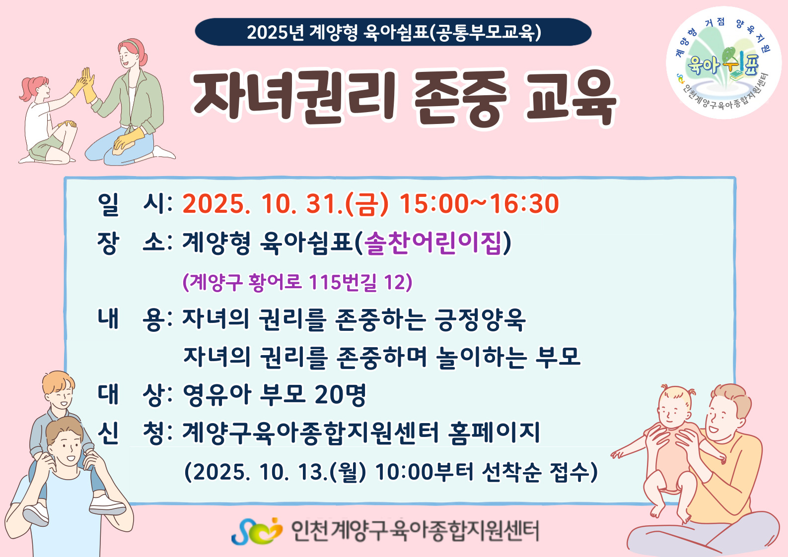 | 기타사항 | 계양형 육아쉼표 교육으로 지역의 거점어린이집에서 진행됩니다. 교육 장소는 솔찬어린이집 입니다. (계양구 황어로 115번길 12) |