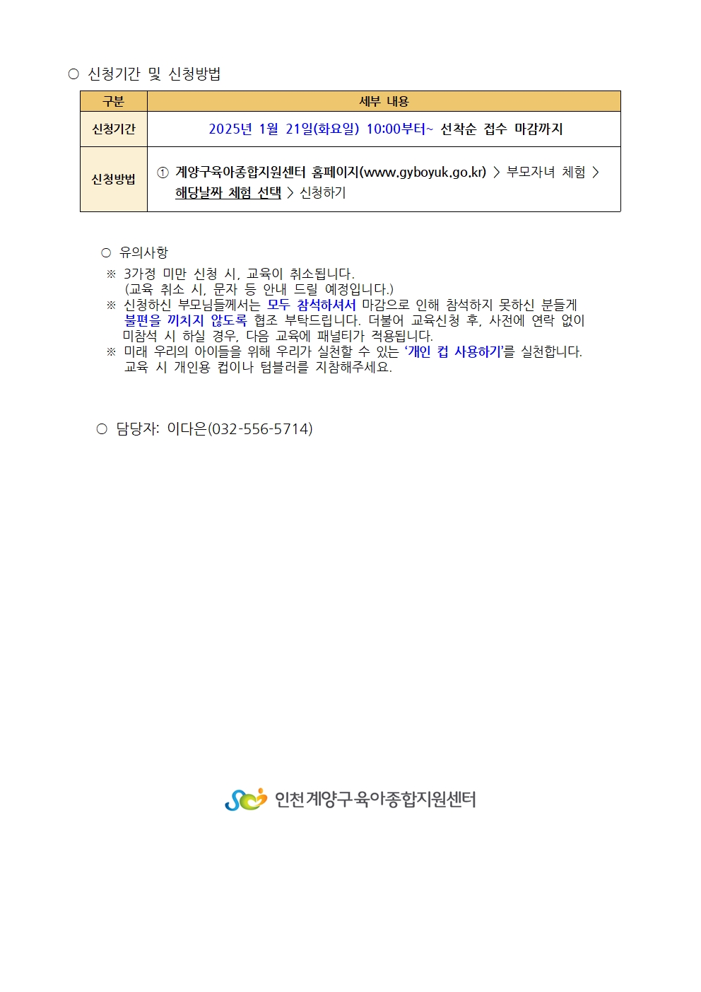 | 기타사항 | ※ 3가족 미만 신청 시, 교육이 취소됩니다. (교육 취소 시, 전화 등 안내 드릴 예정입니다.) ※ 신청하신 부모님들께서는 모두 참석하셔서 마감으로 인해 참석하지 못하신 분들께 불편을 끼치지 않도록 협조 부탁드립니다. ※ 부득이한 사정으로 취소 시 전화연락 바랍니다(032-556-5714) |