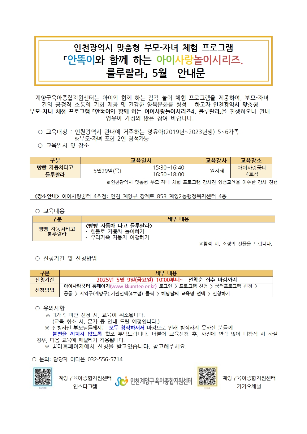 | 기타사항 | **참여 안내 및 유의사항** ※꿈터홈페이지에서만 신청을 받고있습니다. 참고해주세요. ※3가족 미만 신청 시 교육이 취소될 수 있습니다. (취소 시 전화 혹은 문자로 안내드리겠습니다.) ※신청하신 부모님들께서는 모두 참석해 주시기 바랍니다. 3회이상 미참여시 다음 체험 및 교육신청에 제한됩니다. ※부득이한 사정으로 취소 시, 반드시 전화로 연락해 주세요 (032-556-5714). ※해당 연령대에 맞지 않는 신청은 취소될 수 있습니다. 양해 부탁드립니다. ※체험 당일 참석 여부 확인 전화를 받지 않으실 경우, 대기자로 순번이 넘어갈 수 있습니다. ※동일 강의에 대해서는 1회만 신청 가능하며, 중복 신청 시 취소됩니다. |