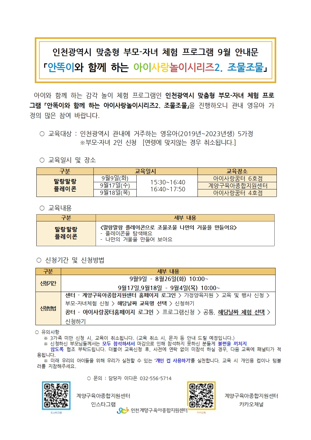 | 기타사항 | **참여 안내 및 유의사항** ※아이사랑꿈터 홈페이지에서만 신청이 가능합니다. ※3가족 미만 신청 시 교육이 취소될 수 있습니다. (취소 시 전화 혹은 문자로 안내드리겠습니다.) ※신청하신 부모님들께서는 모두 참석해 주시기 바랍니다. 당일취소 및 무단불참시 9월 체험 및 교육신청에 제한됩니다. ※부득이한 사정으로 취소 시, 반드시 전화로 연락해 주세요 (032-556-5714). ※해당 연령대에 맞지 않는 신청은 취소될 수 있습니다. 양해 부탁드립니다. ※체험 당일 참석 여부 확인 전화를 받지 않으실 경우, 대기자로 순번이 넘어갈 수 있습니다. ※동일 강의에 대해서는 1회만 신청 가능하며, 중복 신청 시 취소됩니다. |