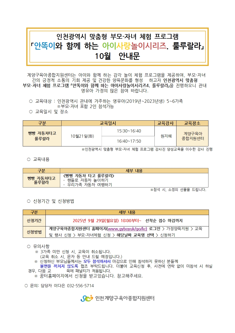 | 기타사항 | **참여 안내 및 유의사항** ※3가족 미만 신청 시 교육이 취소될 수 있습니다. (취소 시 전화 혹은 문자로 안내드리겠습니다.) ※신청하신 부모님들께서는 모두 참석해 주시기 바랍니다. 당일취소 및 무단불참시 9월 체험 및 교육신청에 제한됩니다. ※부득이한 사정으로 취소 시, 반드시 전화로 연락해 주세요 (032-556-5714). ※해당 연령대에 맞지 않는 신청은 취소될 수 있습니다. 양해 부탁드립니다. ※체험 당일 참석 여부 확인 전화를 받지 않으실 경우, 대기자로 순번이 넘어갈 수 있습니다. ※동일 강의에 대해서는 1회만 신청 가능하며, 중복 신청 시 취소됩니다. |