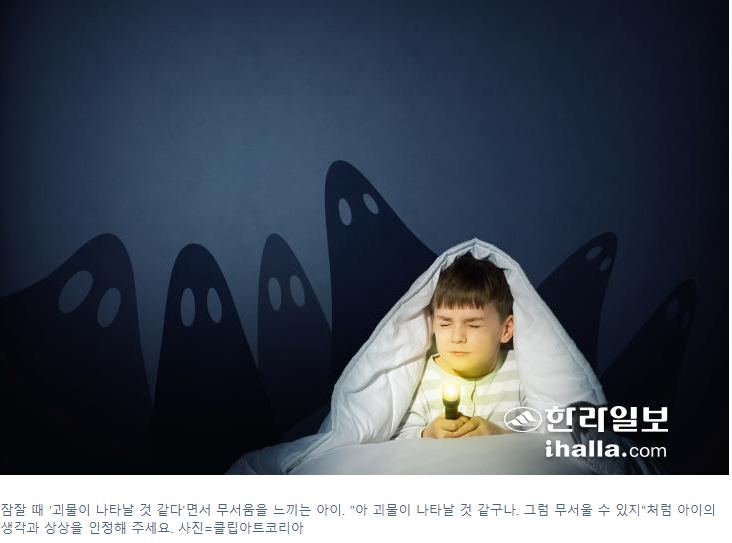"아 괴물이 나타날 것 같구나. 그럼 무서울 수 있지"처럼 말이죠. 아이의 말을 그대로 받아 말해 주면서 무서울 수 있겠다고 인정해 주는 것만으로 아이는 편해질 수 있습니다.