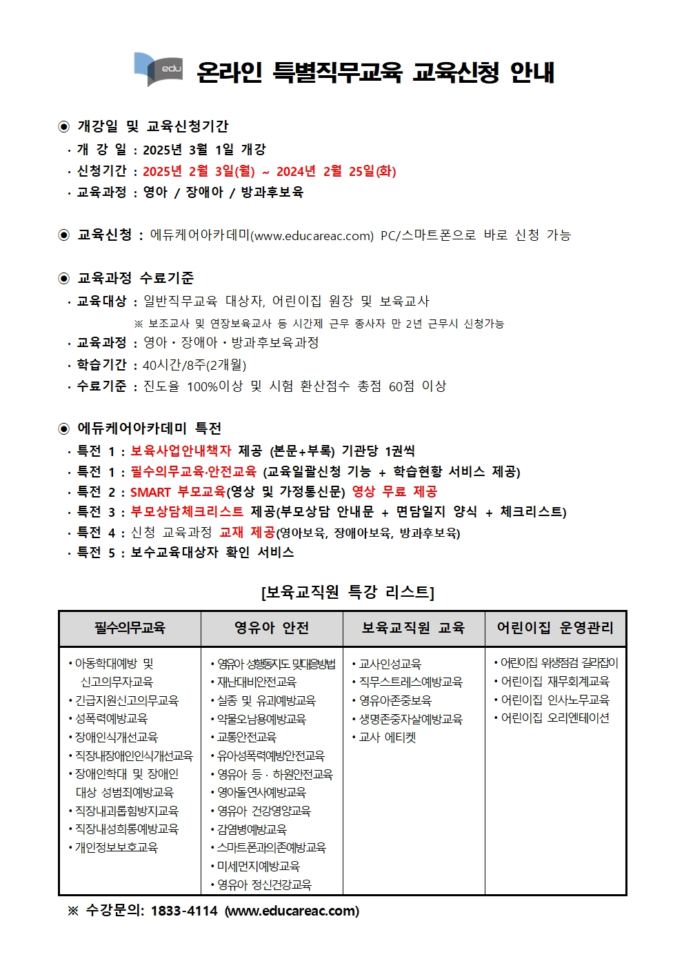 [에듀케어아카데미] 보육교직원 온라인 특별직무교육 2025년 3월 개강 교육신청 안내