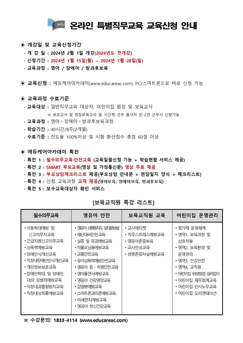 [에듀케어아카데미] 온라인 특별직무교육 신청 안내