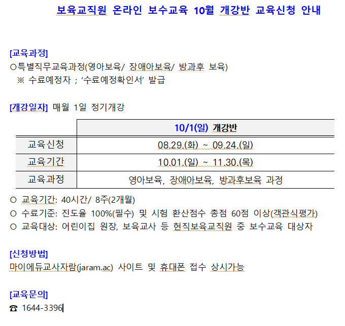 [마이에듀교사자람] (공문) 보육교직원 온라인보수교육 10월 개강반 교육신청 안내