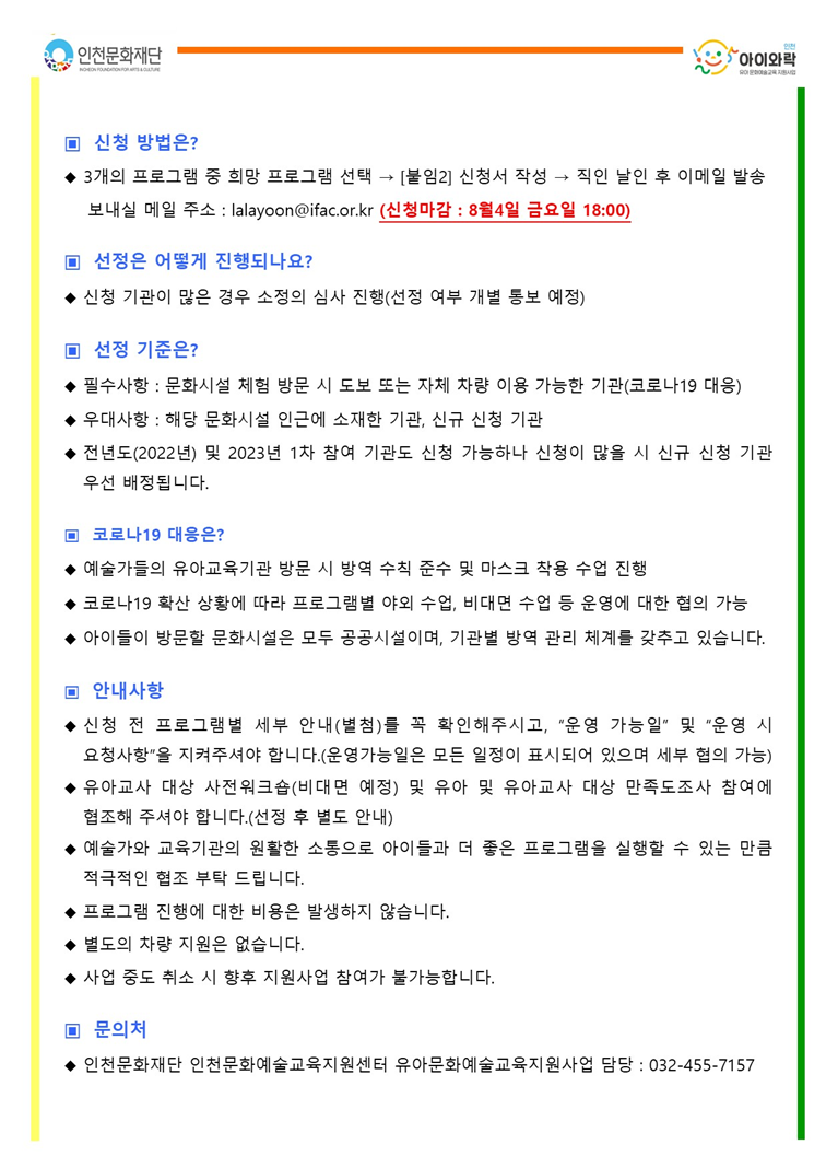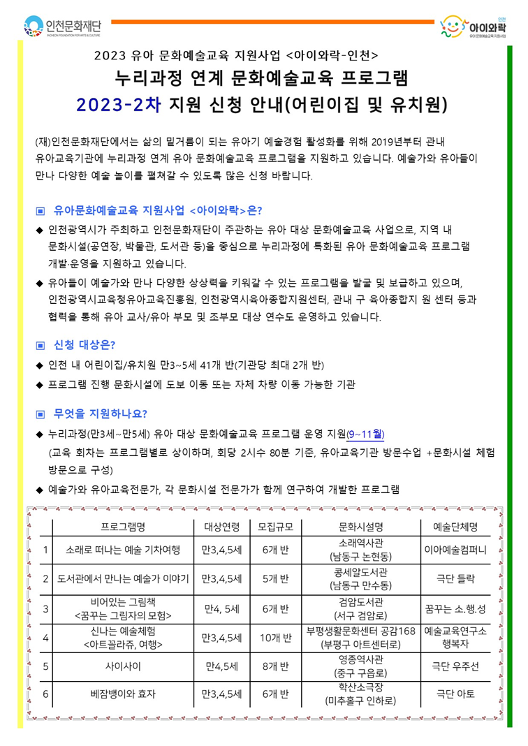 [인천문화재단] 누리과정 연계 유아문화예술교육 프로그램 지원 유아교육기관 모집