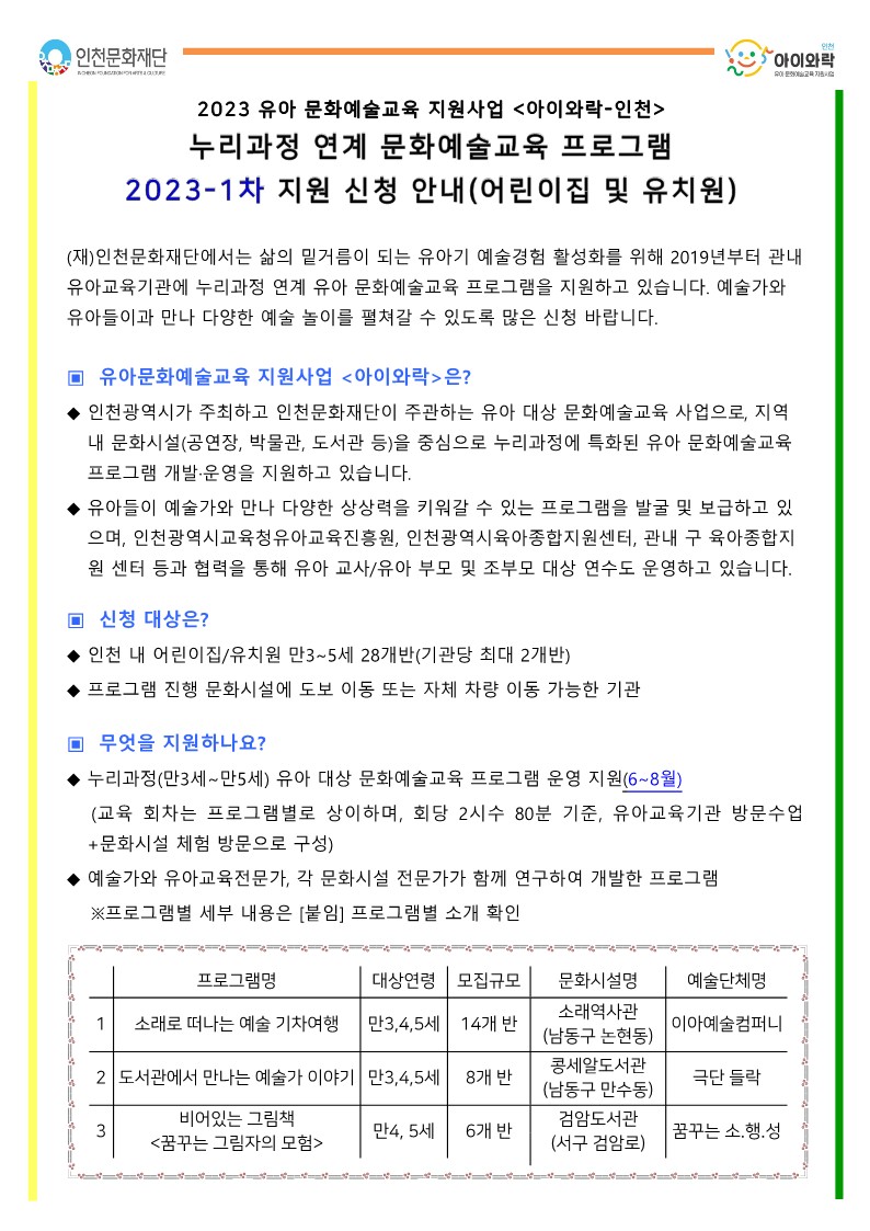 [인천문화재단] 누리과정 연계 문화예술교육 프로그램 <아이와락> 신청안내