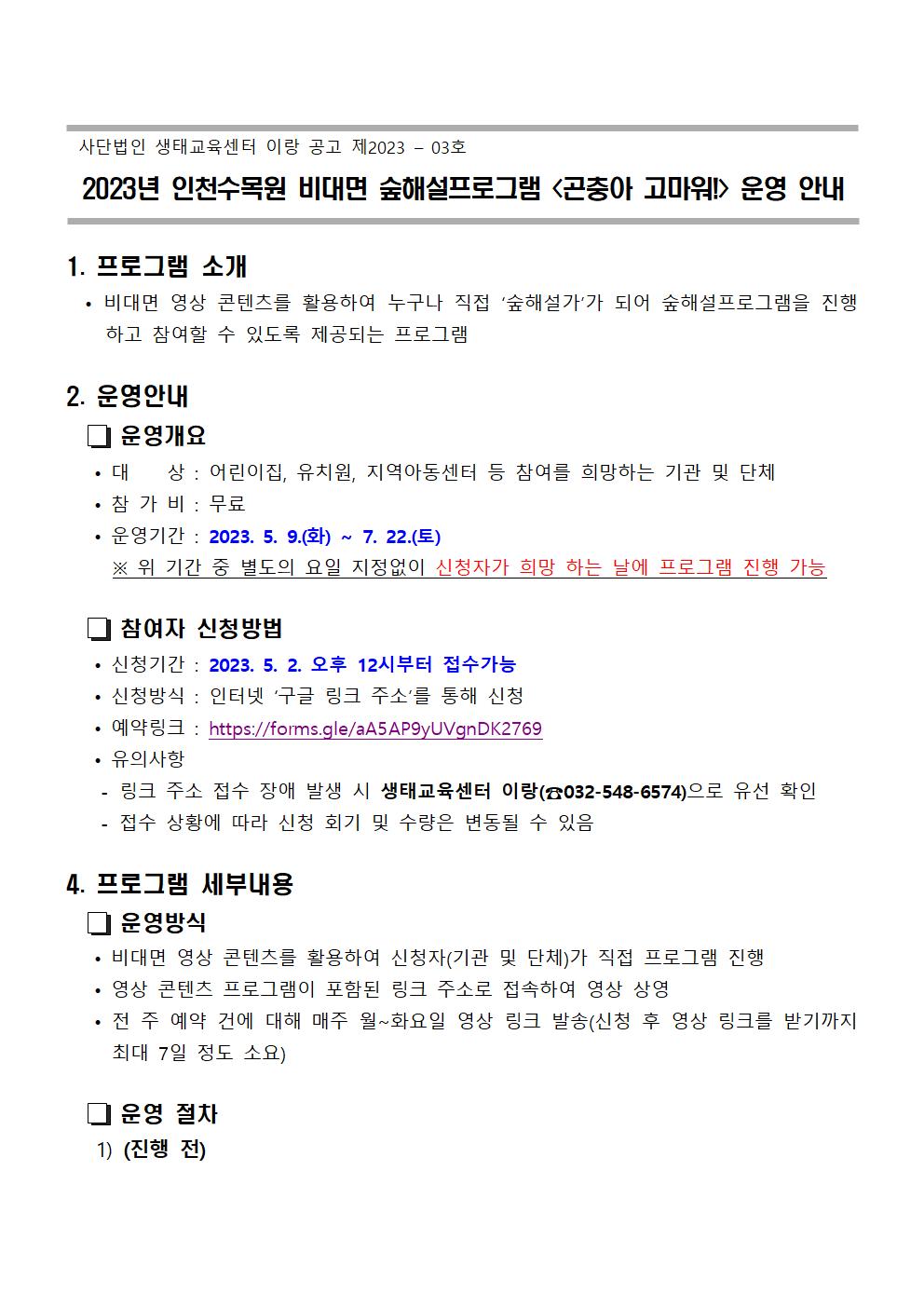 2023년 인천수목원 비대면 숲해설프로그램 <곤충아 고마워!> 운영 안내