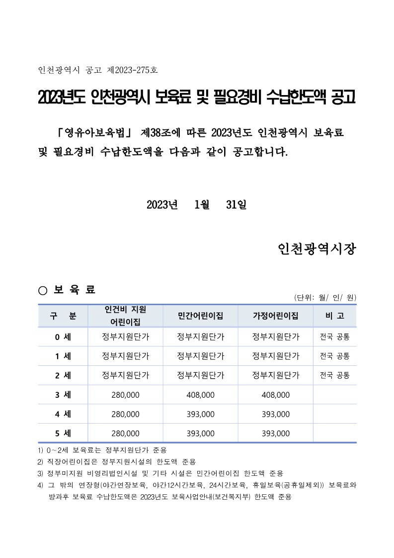 [인천시청] 2023년도 인천광역시 보육료 및 필요경비 수납한도액 공고문
