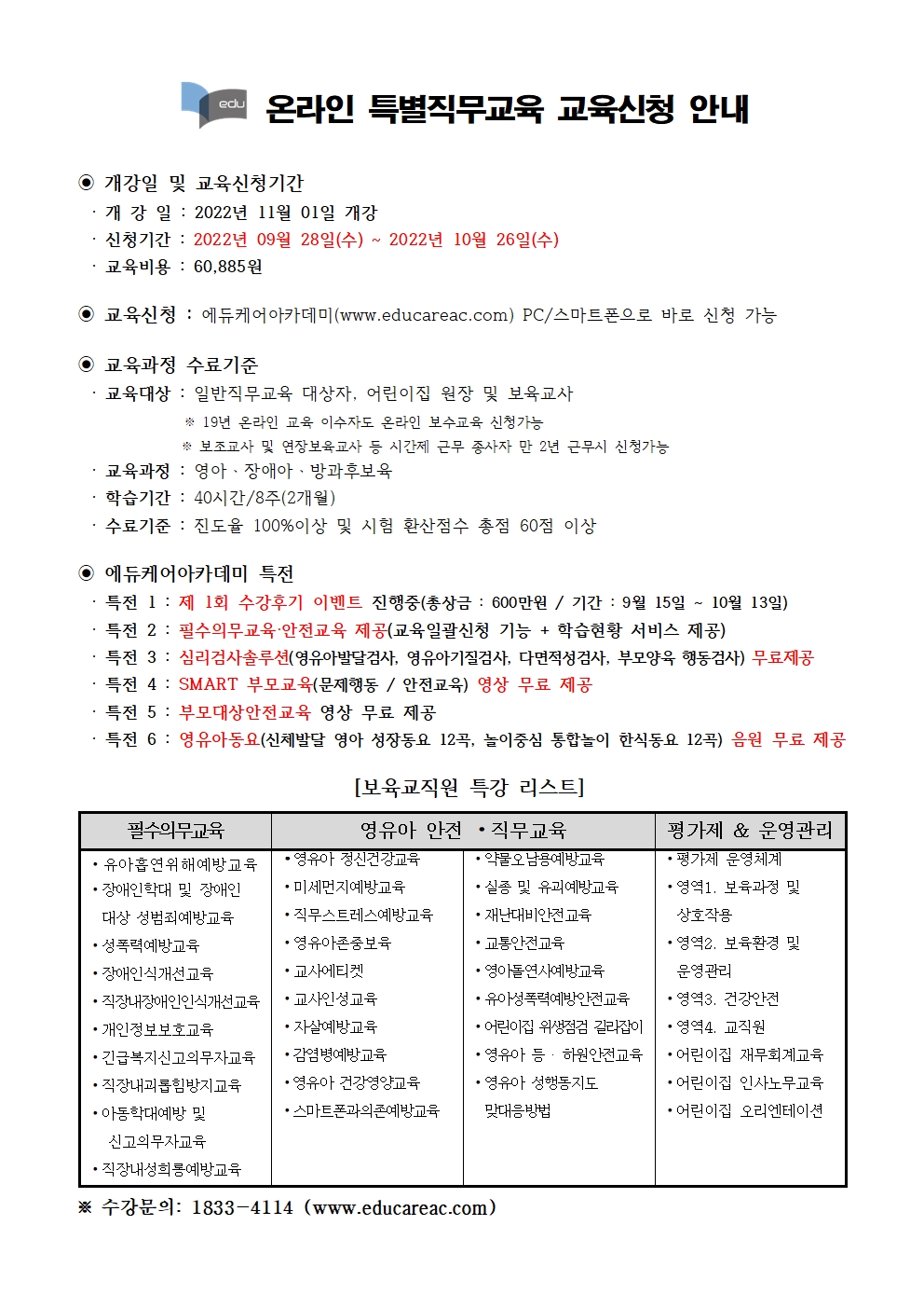 [에듀케어아카데미] 온라인 특별직무교육 개강안내