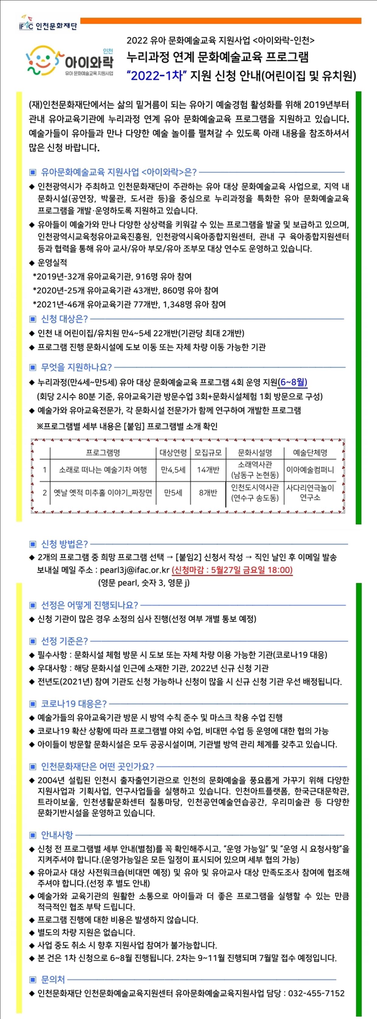 [붙임1]2022-1차 유아교육기관 신청 안내 및 프로그램 소개(유아문화예술교육 지원사업 아이와락-인천).pdf