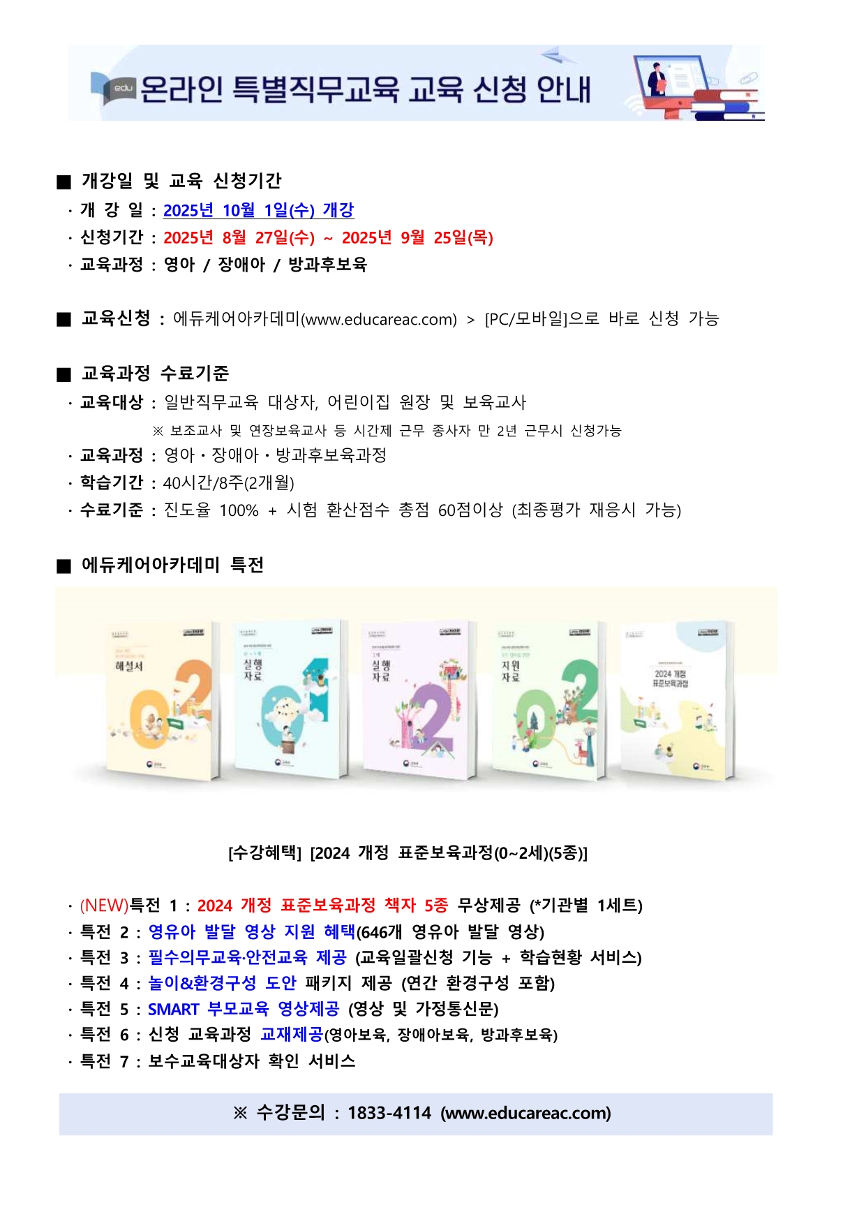 [에듀케어아카데미] 보육교직원 온라인 특별직무교육 2025년 10월 개강 교육신청 안내