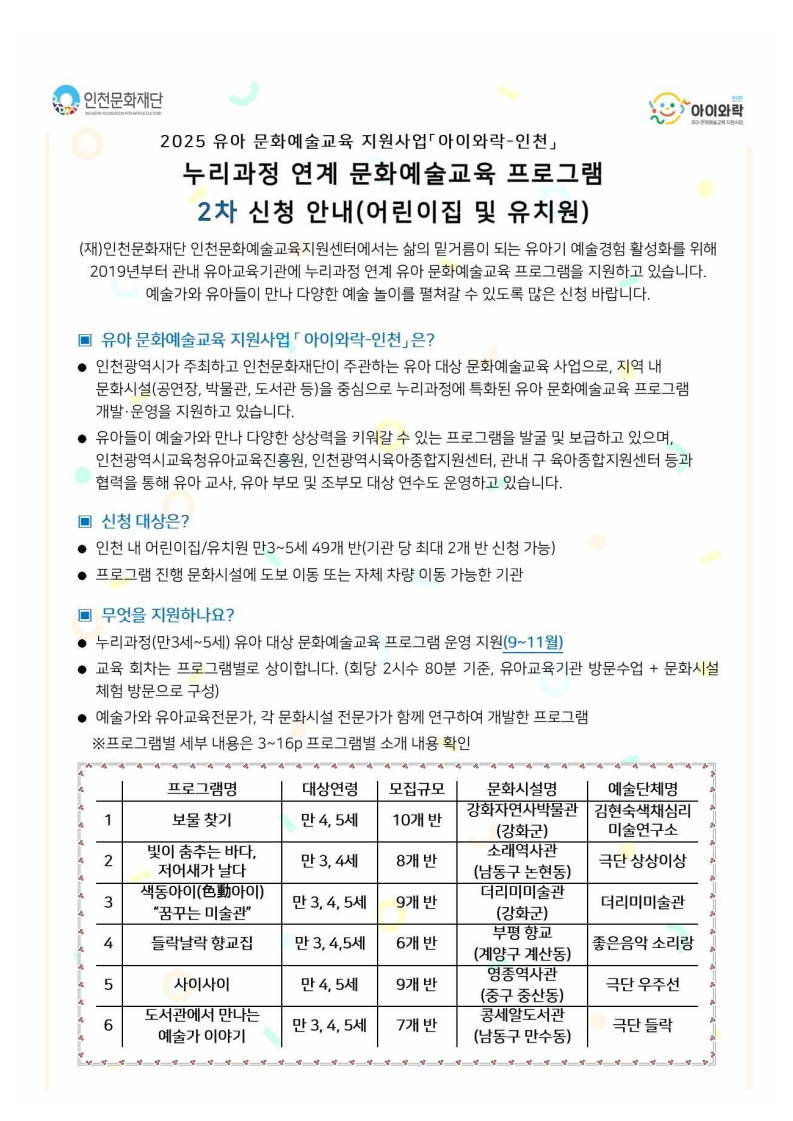 [인천문화재단]누리과정 연계 유아 문화예술교육 프로그램 참여 유아교육기관 모집