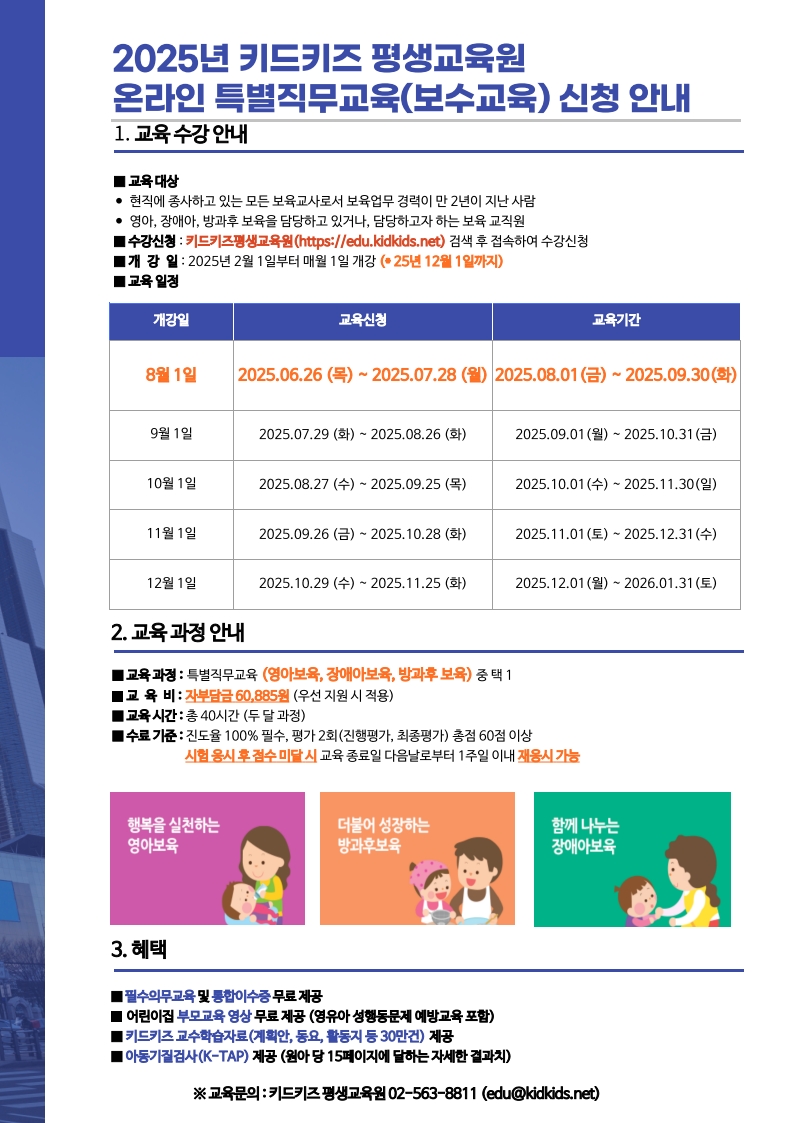 [EK 키드키즈 평생교육원] 보육교직원 온라인 특별직무교육 2025년 8월 개강반 안내