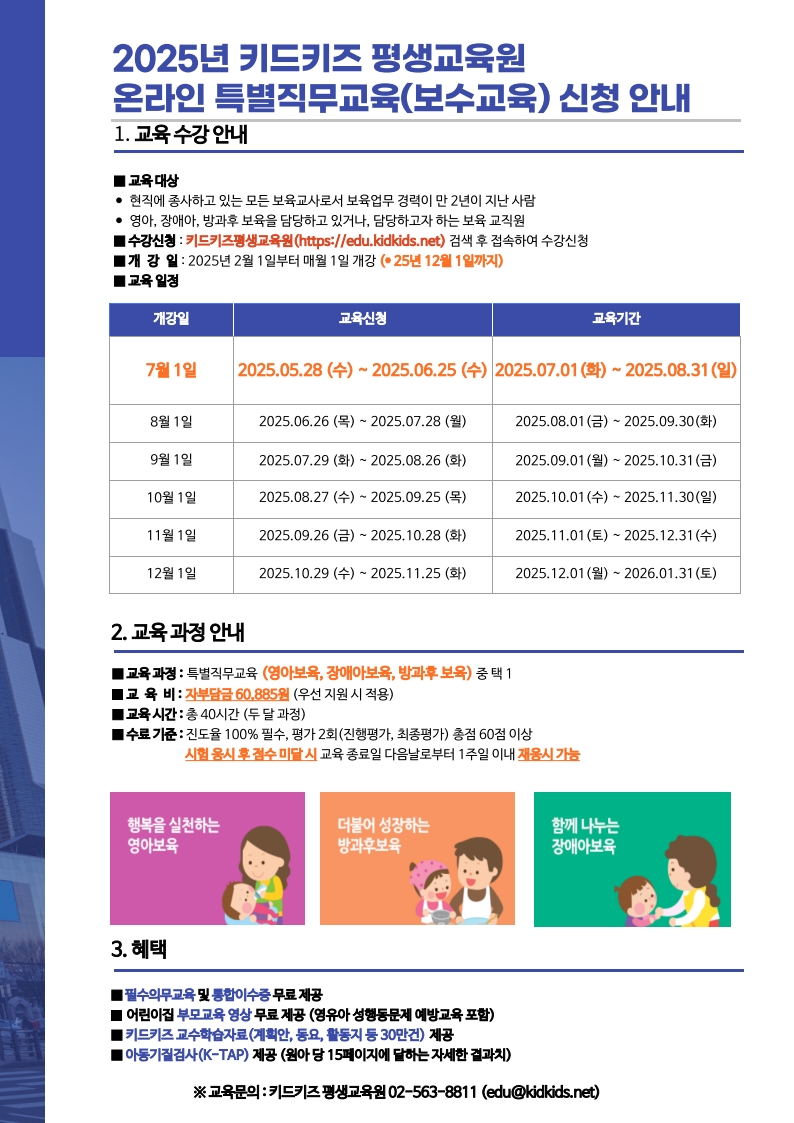 [EK 키드키즈 평생교육원] 보육교직원 온라인 특별직무교육 2025년 7월 개강반 안내