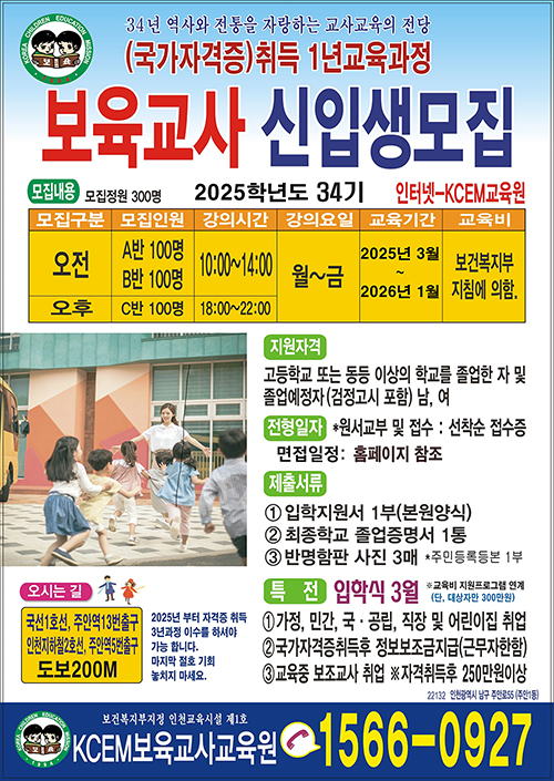 [인천KCEM 보육교사교육원] 2024년 보육교사양성 교육과정 3급 교육생모집