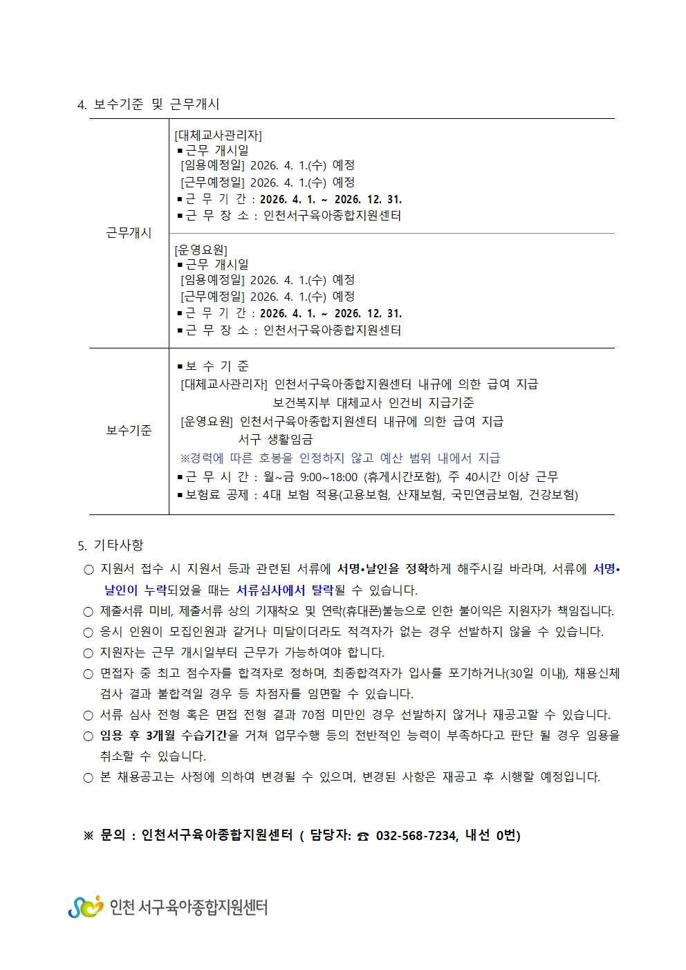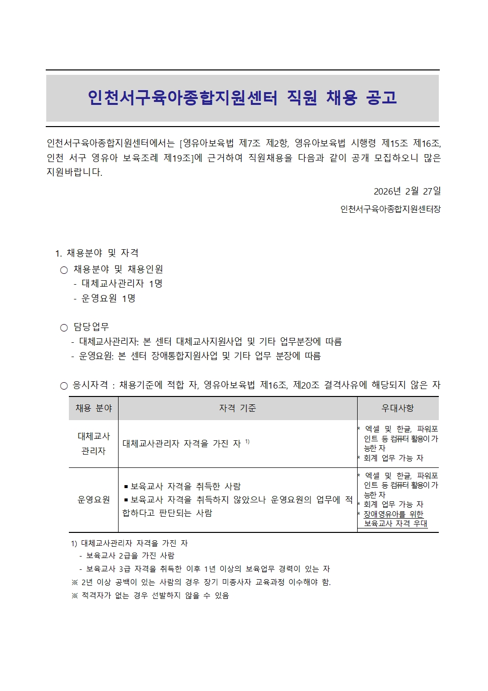 [인천서구육아종합지원센터] 직원(대체교사관리자, 운영요원) 채용 공고