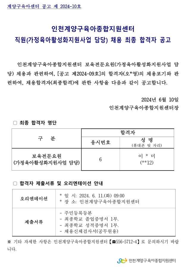 (본센터) 보육전문요원(가정육아활성화지원사업 담당) 채용 최종합격자 공고