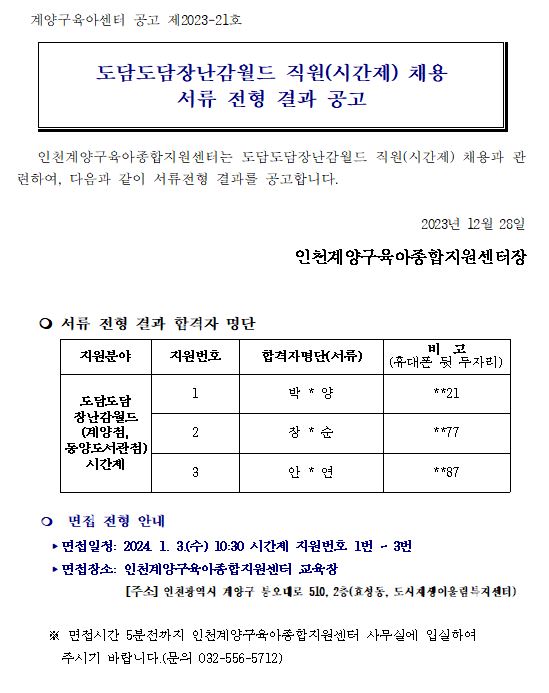 도담도담장난감월드 시간제 채용(충원3차) 서류전형 결과공고