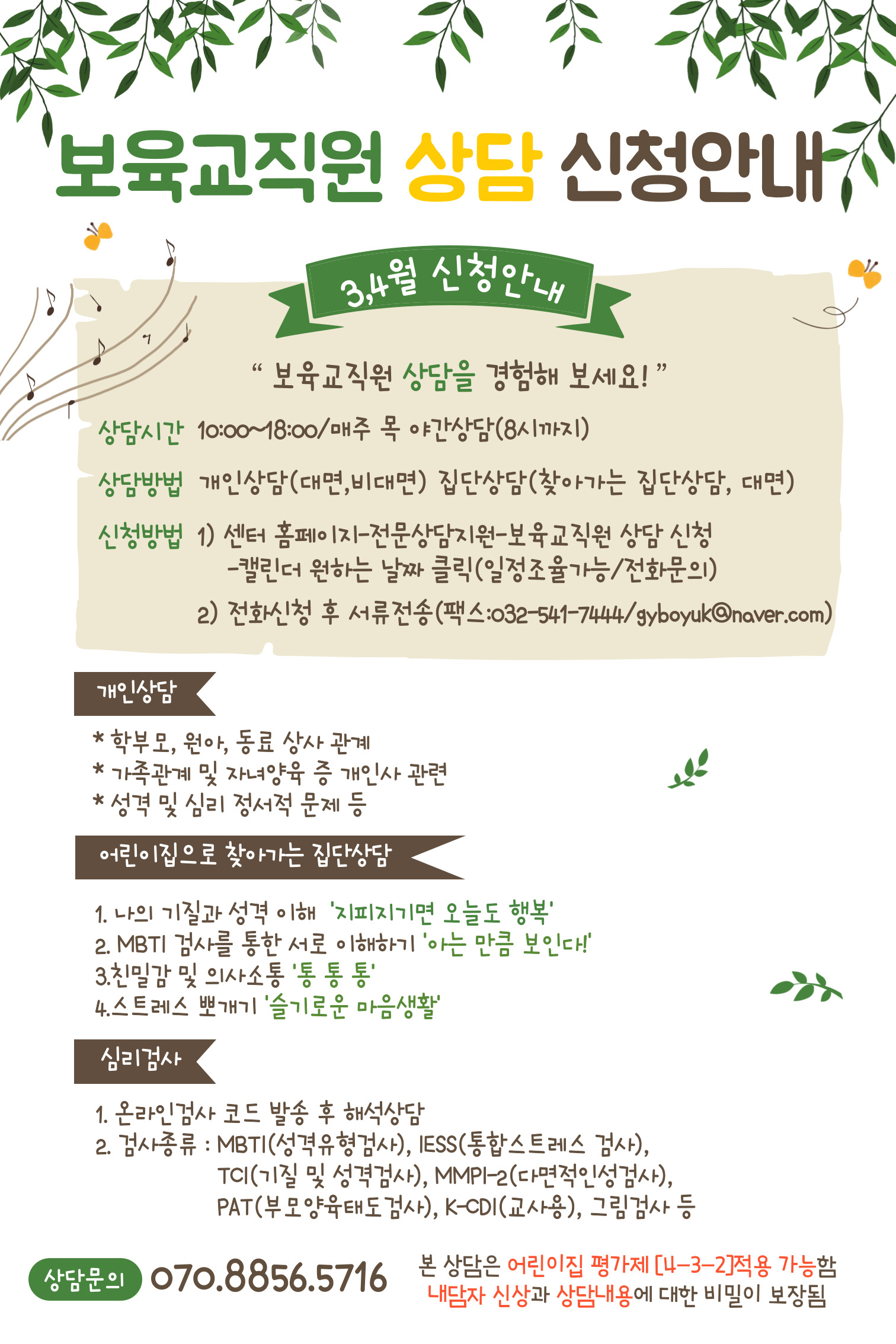 계양구육아종합지원센터에서는 보육교직원의 스트레스 해소와 심리지원을 위해 보육교직원 상담을 진행하고 있습니다.