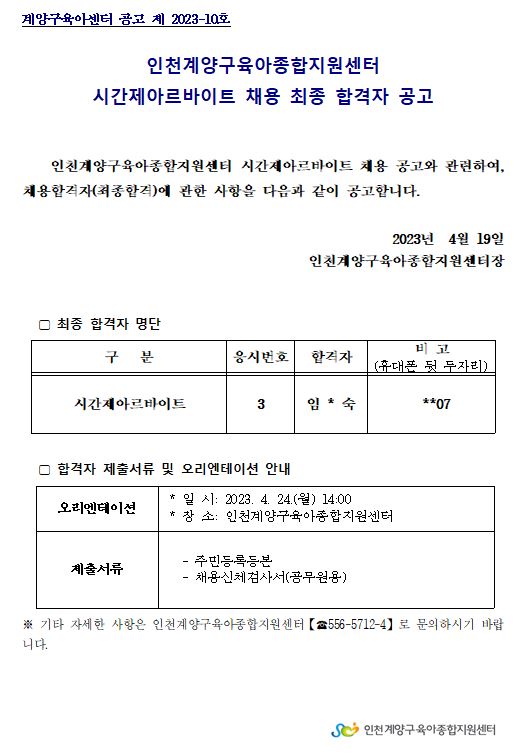 (본센터) 시간제아르바이트 채용 최종합격자 공고