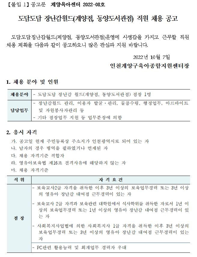 【붙임 1】공고문 계양육아센터 2022-08호_도담도담장난감월드 직원 채용.hwp