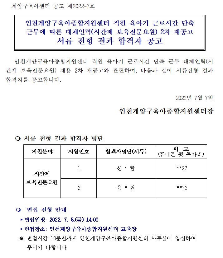 직원 육아기 근로시간 단축 근무에 따른 대체인력(시간제 보육전문요원) 2차 재공고 서류전형 결과 합격자 공고.jpg
