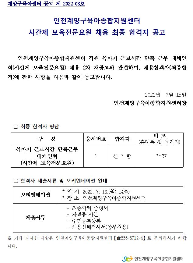 육아기 근로시간 단축 근무 대체인력(시간제 보육전문요원) 채용 최종합격자 공고