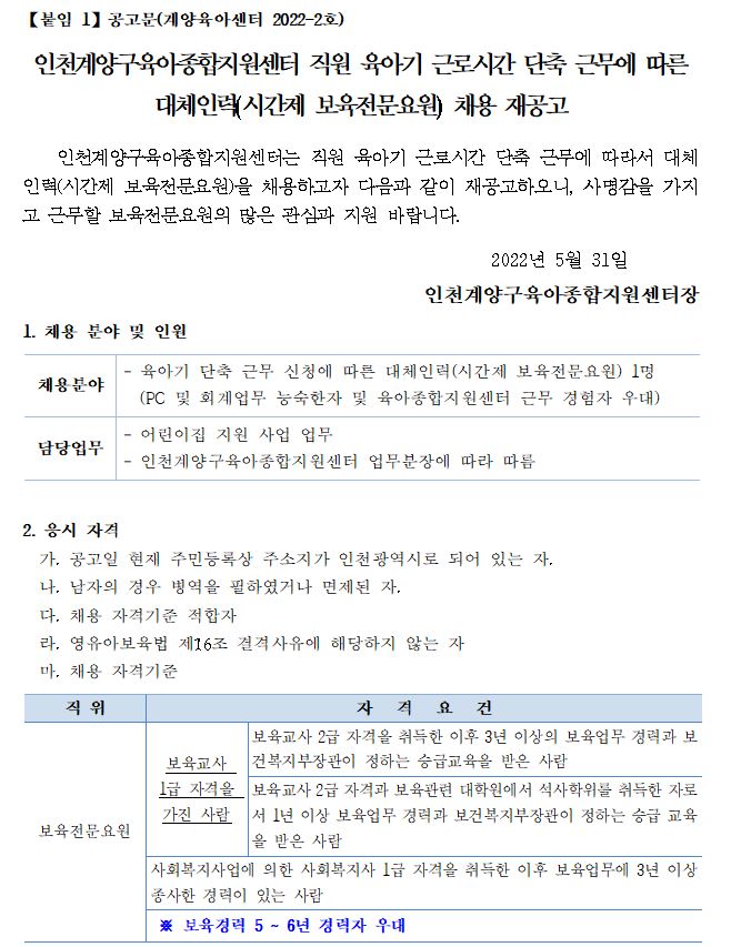 [붙임 1]재공고_직원 육아기 근로시간 단축 근무에 따른 대체인력(시간제 보육전문요원) 채용.hwp