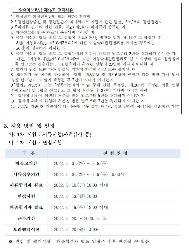 (본센터 채용공고) 직원 육아기 근로시간 단축 근무에 따른 대체인력(시간제 보육전문요원) 채용 재공고