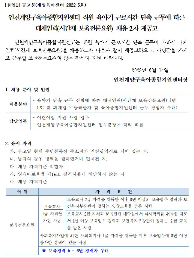[붙임1] 직원 육아기 근로시간 단축 근무에 따른 대체인력(시간제 보육전문요원) 채용 2차 재공고.hwp