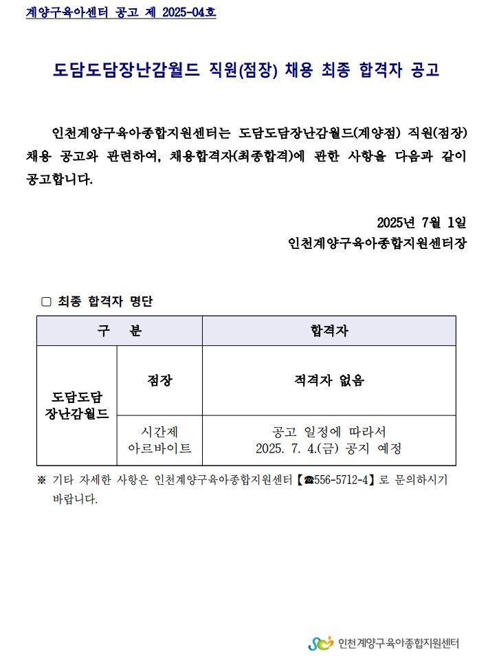 (본센터) 도담도담장난감월드 직원(점장) 최종 합격 공고
