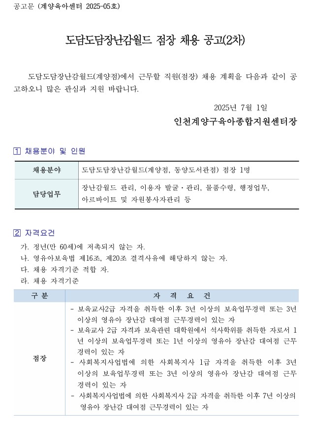(본센터)도담도담장난감월드(계양점) 점장 채용 공고(2차)