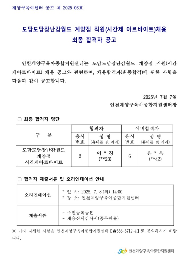 (본센터)도담도담장난감월드 계양점 직원(시간제아르바이트) 최종합격자 공고