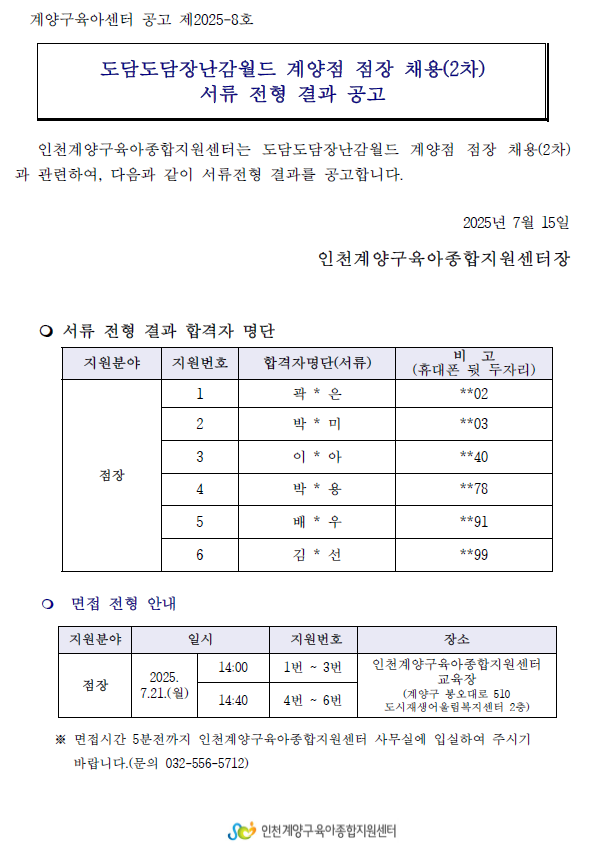 (본센터)도담도담장난감월드(계양점) 점장 서류전형 합격자 공고