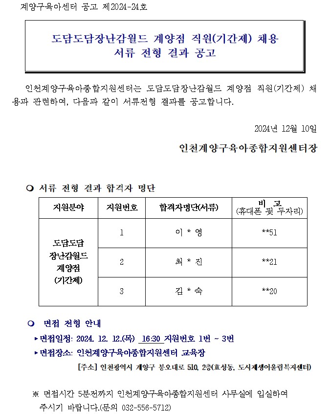 (본센터)도담도담장난감월드 계양점 직원(기간제) 채용 서류전형 합격자 공고
